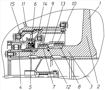 Во время работы двигателя воздух из его проточной части поступает в полость 13 между передней и задней лабиринтными втулками 7 и 8. Часть воздуха из полости 13 проходит через переднее лабиринтное уплотнение, образованное передней лабиринтной втулкой 7 и уплотнительным кольцом 9 статора, и подпирает контактное уплотнение 6, отделяющее воздушную полость 14 от масляной полости 15. Другая часть воздуха из полости 13 проходит через заднее лабиринтное уплотнение, образованное задней лабиринтной втулкой 8 и уплотнительным кольцом 10, и поступает в проточную часть двигателя.