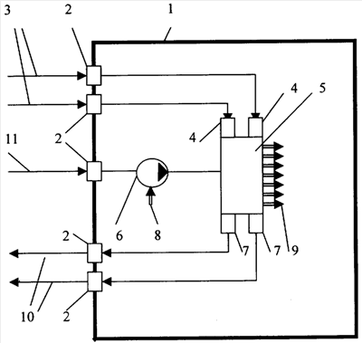 1 – герметичный корпус для замкнутого объема, 2 – герметичный электрический входной разъем, 3 – внешний информационный сигнал, 4 – электропневматические преобразователи сигналов, 5 – набор (комплект) функциональных проточных элементов, составляющих, например, струйную систему управления, 6 – побудитель расхода, 7 – пневмоэлектрические преобразователи сигналов, 8 – поток всасывания рабочей среды в побудитель, 9 – каналы слива рабочей среды из проточных камер струйных элементов, 10 – информационный сигнал, исходящий от устройства управления, 11 – подвод электропитания к побудителю расхода.