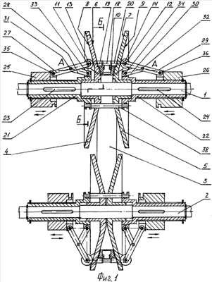 Диски 4 и 5 каждого передающего элемента снабжены соосными между собой и параллельными осям валов 1 и 2 отверстиями, а фланцы опорных втулок 21 и 22 соединены между собой направляющими 38, параллельными осям валов 1 и 2 и проходящими через упомянутые отверстия в дисках 4 и 5.