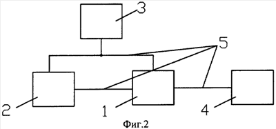 На фиг.2 представлена функциональная схема предлагаемого объемно-замкнутого гидропривода, где (фиг.1 и 2): 1 – регулируемый поршневой насос, 2 – система подпитки, 3 – управляющее звено, 4 – гидродвигатель, 5 – линии связи.