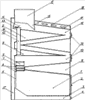 Котел содержит топку 1 с дверцей 2, зольник 3 с дверцей 4, канал подачи вторичного воздуха 5, корпус дожигового устройства 6, решетки 7, три ряда отверстий 8, теплообменные площади 9, газоходные камеры 10, каждая из которых имеет створку для чистки 11, эжектор 12, держатель термостата 13, биметаллический термостат 14, дымоход 15, газообводящий экран 16, вся конструкция котла собрана в двустенном корпусе 17, змеевик горячего водоснабжения 18, направляющие 19.