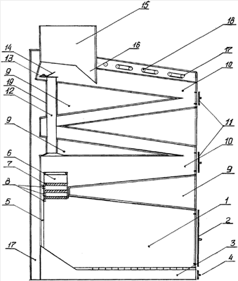Над топкой (1) расположены теплообменные площади (9), образующие газоходные камеры (10). Площадь сечения газоходной камеры равна площади сечения дымохода (15). Такая пропорция сечений позволяет топочным газам охватывать всю теплообменную площадь (9), увеличивая ее эффективность. Газоходные камеры (10) меняют направление топочных газов, что способствует их перемешиванию и полной отдаче тепловой энергии. Каждые спаренные газоходные камеры (10) имеют створки (11) для чистки и обслуживания.