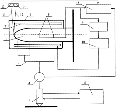 После размещения всего оборудования выбирают точку на объекте испытаний 1, перемещение которой необходимо определить. На этой точке закрепляют концы вольфрамовой и нихромовой (из сплава 1Х13Н16Б) проволок 11, 12 и пропускают их через технологическое отверстие в корпусе отражателя 6. Напротив этого отверстия вплотную друг к другу устанавливают потенциометрические датчики 13, 14 и соединяют их подвижные части с проволоками 11 и 12. Ходовые части датчиков подпружинены и держат проволоки 11, 12 постоянно натянутыми.
