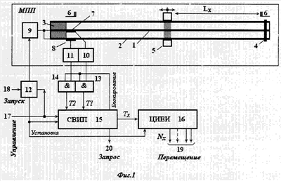Одни концы звукопроводов 1 и 2 заключены в акустический поглотитель 3 и подключены к выходу усилителя 9 записи. С этой же стороны, вблизи поглотителя 3, на звукопроводах 1 и 2 МПП жестко закреплены электроакустические преобразователи 7 и 8, которые через одноименные усилители 10, 11 считывания, логические элементы И 13, 14 подсоединены к входам синхронизации СВИП 15. Отражающая нагрузка 4 закреплена на других концах звукопроводов 1 и 2. Соосно с ними закреплен кольцевой постоянный магнит 5 с возможностью продольного перемещения между ограничителями 6 перемещений. Магнит 5 имеет кинематическое соединение с контролируемым объектом. Один выход формирователя 12 импульсов соединен с входом усилителя 9 записи, а другой – с единичными входам СВИП 15 и нулевым входом ЦИВИ 16. Его сигнальный вход подключен к шине 18 запуска, а управляющий соединен с нулевым входом СВИП 15 и подключен к шине 17 управления. Один выход СВИП 15 соединен с входом синхронизации ЦИВИ 16, разрядные выходы которого подключены к шинам 19 результата. Другой его выход соединен с управляющими входами логических элементов И 13 и 14, а третий выход подключен к шине 20 синхронизации.