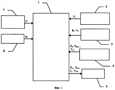 1) Приема от измерителей 2, 3, 6 и 7 соответственно значений вектора продольной скорости судна Vc={|Vc|, cv}, где |Vc| – абсолютная величина продольной скорости судна и cv – угол между направлением на север и направлением продольной скорости судна, географических координат судна ( c, c), курсового угла к, угловой скорости поворота корпуса судна в горизонтальной плоскости ; вычисления с периодом текущего расстояния L от носа судна до начала узкого участка фарватера, скорости сближения судна Vсб с началом узкого участка фарватера, пересчета географических координат судна ( с, с) в координаты (xцм, yцм) центра масс судна в системе координат XoY, пересчета географических координат пл, пл, пп, пп соответственно левой и правой границ узких участков фарватера в координаты xпл, xпп соответственно левой и правой границ проекции узких участков фарватера на ось оХ, вычисления наборов Xс, Xсп координат проекций на ось оХ текущего и прогнозируемого положения корпуса судна Хс={xцм, xсл, xсп} и Хсп={xцмп, xслп, xспп}, где xцм – координата проекций на ось оХ текущего положения центра масс судна, xсл, xсп – координаты левой и правой границ проекции на ось оХ текущего положения корпуса судна, xцмп – координаты проекции на ось оХ прогнозируемого положений центра масс судна, xслп, xспп – координаты левой и правой границ проекции на ось оХ прогнозируемого положения корпуса судна.