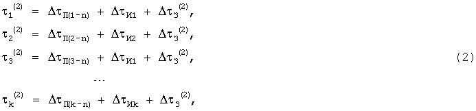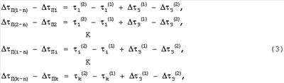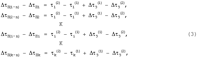 в этой системе уравнений неизвестными являются k погрешностей задержек и  З (1),  З (2), а члены 1 (1), 2 (1), …, k (1) и 1 (2), 2 (2), …, k (2) – известные числа, полученные экспериментально при снятии суммарных погрешностей имитатора 1 навигационных сигналов и аппаратуры 3 навигации.
