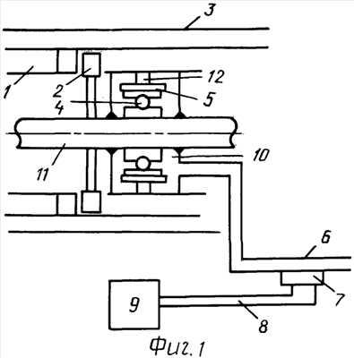 Устройство для контроля и диагностирования состояния подшипников качении и других элементов газотурбинного двигателя включало трубу слива масла 6 (первичный источник колебаний) из масляной полости 5 заднего подшипника 12 силовой турбины, на которой был установлен преобразователь сигнала колебаний 7, передающий электрический сигнал по линии связи 8 устройству обработки информации 9.
