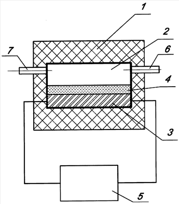 Калориметрическое вещество 3, с нанесенными на его поверхности катализатором 4, помещают в специальный корпус, который образует камеру сгорания 2 с узлами механического крепления и патрубками для подвода смеси природного газа и окислителя 6 и отвода продуктов сгорания 7. Камеру сгорания 2 помещают в пассивный или активный термостат 1 для обеспечения условий адиабатичности относительно внешней среды.