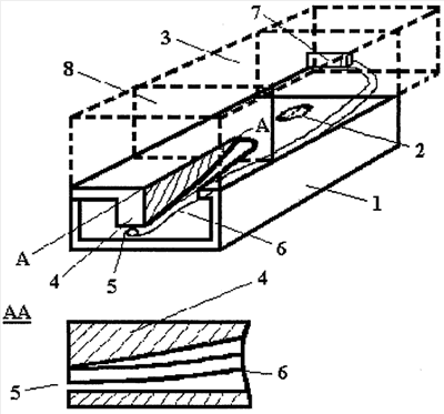 Открытый резонатор 1 представляет собой прямоугольную полую металлическую коробку заданных размеров, в верхней части которой имеется отверстие 2 для подвода электромагнитной энергии (штыревой ввод), генерируемой осциллятором 3, сопряженным с циркулятором для согласования амплитуды колебаний, установленным в районе отверстия 2 (не показан). Соответственно, внутри резонатора возникает стационарное распределение электромагнитного поля. При наличии прямоугольной вставки 4 переменной высоты напряженность электрического поля монотонно увеличивается по направлению к открытой части резонатора, достигая максимального значения на торце 5. Световое излучение к поверхности полупроводника подводится по световоду 6, сопряженному с полупроводниковым лазером 7 и непосредственно вставленному в щель резонатора, обеспечивая максимальную локальность измерения времени жизни. Отраженная от поверхности полупроводника электромагнитная волна модулирует напряженность поля в щели, вызывая изменение волнового поля в резонаторе, и, как следствие, вызывает появление электрического сигнала в детекторной цепи устройства, который усиливается и обрабатывается в блоке предварительного усиления 8.