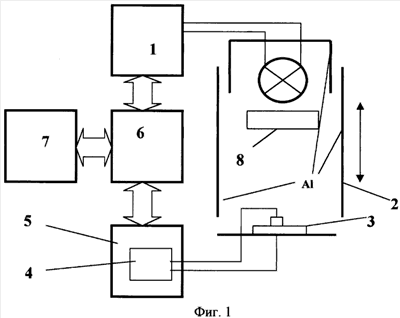 Наличие системы обратной связи, включающей датчик освещенности исследуемого объекта, и конвертора емкости солнечного элемента 4 на основе управляемого усилителя напряжения совместно с измерительными усилителями с последующим преобразованием выходных сигналов в цифровую форму посредством АЦП (аналого-цифровой преобразователь) и ЦАП (цифроаналоговый преобразователь) для связи измерительного блока 5 с компьютером 7 позволяет жестко регулировать напряжение смещения на внешних электродах солнечного элемента 3, одновременно измеряя величину тока, протекающего через него в зависимости от заданного напряжения смещения на электродах солнечного элемента. Напряжение, приложенное к солнечному элементу, можно регулировать (програмно, с использованием компьютера 7) при использовании контроллера 6 и ЦАП измерительного блока 5 в соответствии с желаемой функцией напряжения смещения от времени, обеспечивая минимальность отклонения формы нагрузочной динамической вольтамперной характеристики от ее статического вида. Фактически, схемотехническая реализация управляемого усилителя напряжения смещения одновременно является аналоговым конвертором (активным аналоговым преобразователем) диффузионной и барьерной емкостей солнечного элемента, снижая их величину до значений, при которых динамическая вольтамперная характеристика перестает отличаться от статической.