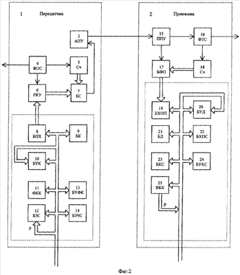 Вход управляющего кода РКУ 6 и соответствующий ему выход БПХ 8, а также выход БФО 17 и соответствующий ему кодовый вход БХОП 19 могут быть выполнены с использованием интерфейса типа S-232, или по ГОСТ 18977-79, или по ГОСТ 26765.52-87. Информационные входы-выходы передатчика 1 и приемника 2 могут быть реализованы с использованием стандартных СОМ-портов типа RS-232.