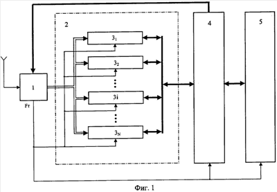 Обобщенная структурная схема многоканального приемника СРНС (фиг.1) состоит из связанных друг с другом блока 1 радиочастотного преобразования, блока 2 многоканальной корреляционной обработки, состоящего из N каналов 3 (31, 32, …, 3N), каждый из которых способен обрабатывать сигнал любого спутника, вычислителя 4 и блока 5 периферийных устройств.