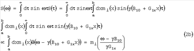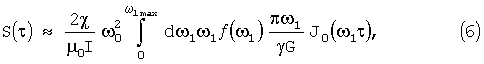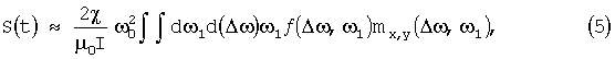 где – ядерная магнитная восприимчивость, 0 – проницаемость свободного пространства, I – ток в катушке, = B, a  = 0– В0. Функция f представляет собой концентрацию протонов при данной частоте смещения и амплитуде радиочастотного магнитного поля. Величины mx,y представляют собой компоненты поперечной намагниченности, нормированные на единицу в равновесном состоянии. В обозначает магнитное поле, а 0 – угловую частоту радиочастотного магнитного поля. Интегрирование уравнения (5) следует проводить по всем значениям и  , но реально интегрирование по  можно ограничить несколькими кратными .