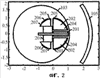 На фиг.2 (уровень техники) представлен предпочтительный вариант конструкции зонда ЯМК, показанный в разрезе плоскостью, перпендикулярной продольной оси прибора ЯМК, которая обычно параллельна оси скважины 103. Блок магнитов 201 создает постоянное магнитное поле, имеющее заданное распределение в зоне 105 исследования окружающих скважину 103 горных пород. Главная радиочастотная антенна 202 при работе на передачу создает в зоне исследования радиочастотное магнитное поле, а при работе на прием принимает сигнал ЯМР из области возбуждения (зоны исследования) пласта пород. Главная радиоантенна, являющаяся первой (рабочей) антенной, включает в себя обмотку 203 и сердечник 204 из магнитомягкого материала, предназначенный для повышения эффективности работы первой антенны в режимах передачи и приема сигналов. В больших скважинах вторая антенна 205 служит активным глушителем паразитных сигналов и содержит обмотку 206 и предпочтительно сердечник 207 из магнитомягкого материала, предназначенный для повышения эффективности подавления паразитных сигналов. Обмотки рабочей антенны и антенны-глушителя могут состоять как из одного витка плоской проволоки, так и из множества витков. Прибор, выполненный по такой схеме, хорошо работает в скважинах диаметром 12 дюймов (30 см) или близких к тому. В скважинах меньшего размера (обычно менее 8 дюймов в диаметре) вторая антенна может использоваться в режиме вспомогательной антенны, описанном в патенте US 6525535.