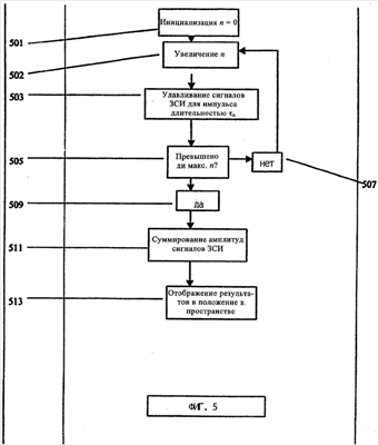 На фиг.5 представлена блок-схема осуществления настоящего изобретения в его первом варианте. Максимальное число членов nmax для представляющего функцию Бесселя ряда в уравнении (7) уже выбрано. Этот выбор проводят опытным путем и на основании знания градиента радиочастотного магнитного поля, создаваемого прибором. Практическим ограничением здесь выступает время, затрачиваемое на получение данных. На шаге 501 значение n изначально устанавливается равным нулю и повышается на шаге 502. Длительность импульса 1 определяется из уравнения (8) по первому нулю функции Бесселя нулевого порядка, т.е. 2,4048. На шаге 503 принимается сигнал ЗСИ, соответствующий выбранному значению длительности импульса. На шаге 505 производится проверка непревышения максимального числа импульсов. При получении на шаге 507 ответа “нет” на шаге 502 происходит увеличение значения n, выбор другой длительности импульса и обнаружение сигнала ЗСИ. При получении на шаге 509 ответа “да” полученные данные после их преобразования в частотную область подвергаются на шаге 511 обратному преобразованию Ганкеля в соответствии с уравнением (7) с получением спиновой плотности как функции радиочастотного магнитного поля (в частотной области). С использованием известного изменения в пространстве напряженности радиочастотного поля на шаге 513 производится простое отображение радиочастотного магнитного поля в положение в пространстве. После выполнения этого этапа непосредственно определяется составляющая сигнала, полученная изнутри скважины (т.е. из скважинной жидкости), и составляющая сигнала, полученная извне скважины. В предпочтительном варианте устройства, рассмотренном выше со ссылкой на фиг.2, задается некоторое пороговое значение напряженности радиочастотного магнитного поля (порог отсечки), разделяющее распределение на две части. Часть распределения, оказавшаяся ниже порогового значения, соответствует сигналу из ствола скважины, а часть, оказавшаяся выше порогового значения, соответствует сигналу от породы. Используя описанный выше способ, можно определить представляющие интерес параметры горных пород, такие как функция спиновой плотности.