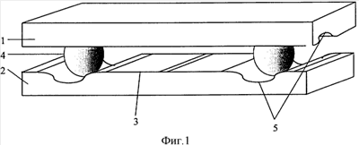 Глубина канала 5, которая обеспечивает фиксацию спейсера 4, составляет от одного до сорока процентов высоты спейсера 4. Концы спейсеров 4 находятся в углублениях каналов 5 верхней и нижней подложек 1 и 2 в местах пересечения каналов 5, причем форма концов спейсеров 4 повторяет форму каналов 5.