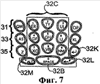 В варианте выполнения изобретения, показанном на Фиг.7, каждой клавише 32А присваивают самое большее два буквенных значения. Клавиша 32К RETURN может быть расположена там, где находится крайняя правая клавиша третьего ряда 35. Клавиша 32L BACKSPACE представляет собой крайнюю правую функциональную клавишу рядом с клавишей 32В SPACE, которая расположена ниже третьего ряда 35. Клавиша 32М ALT представляет собой крайнюю левую функциональную клавишу рядом с клавишей 32В SPACE. В отличие от компоновки, показанной на Фиг.6, компоновка клавиатуры, приведенная на Фиг.7, требует использования дополнительных клавиш вне клавиатуры для того, чтобы осуществлять ввод цифр, расположенных в пределах пунктирных линий 32С, и ввод букв верхнего регистра.