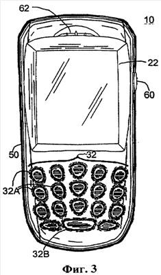 На Фиг.3 представлен вид устройства спереди. Передний корпус 50 содержит несколько отверстий для соединения с множеством устройств ввода и вывода. Динамик 62, дисплей 22, клавиатуру 32 и микрофон (не показан) предпочтительно устанавливают внутри у передней поверхности 50 корпуса устройства. Предпочтительно динамик помещают над дисплеем 22 вблизи верха переднего корпуса 50 примерно посередине, если смотреть по горизонтали, передней поверхности 50. Динамик 62 располагают над дисплеем 22. Ниже динамика 62 у центральной части передней поверхности 50 устанавливают дисплей 22. Хотя на Фиг.3 показан дисплей 22 прямоугольной формы, можно также использовать дисплей другой геометрической формы. Курсорную клавишу 60 предпочтительно располагают в непосредственной близости к дисплею.