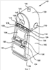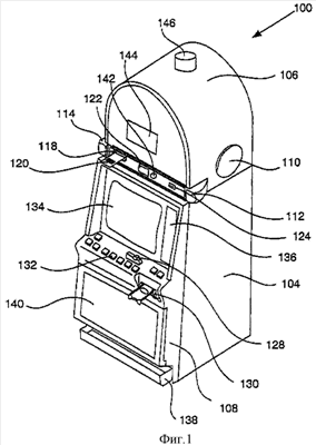 Игровая машина 100 имеет верхнюю приставку 106, которая установлена на верхней поверхности основного корпуса 104. В верхней приставке 106 размещен ряд устройств, которые могут использоваться для придания дополнительных особенностей игре, запускаемой на игровой машине 100, включая динамики 110, 112, 114 и билетопечатающее устройство 118, которое может печатать билеты со штриховым кодом 120, используемые как безналичные инструменты. В верхней приставке 106 установлен вторичный дисплей 144, который может быть также снабжен сенсорным экраном. Вторичный дисплей 144 может быть также использован для приема вводимой подписи игрока с помощью электроники и/или для работы интерфейсов игровых услуг.