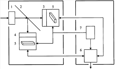 Принцип работы предлагаемого изобретения поясняется с помощью чертежа. Устройство содержит оптическую систему 1, разделитель светового потока 2, светофильтры 3 и 4, однокоординатные приемники излучения 5, блок микроконтроллера 6, блок питания 7.