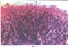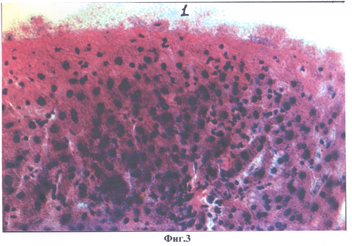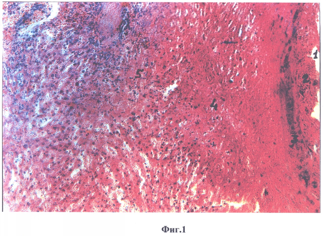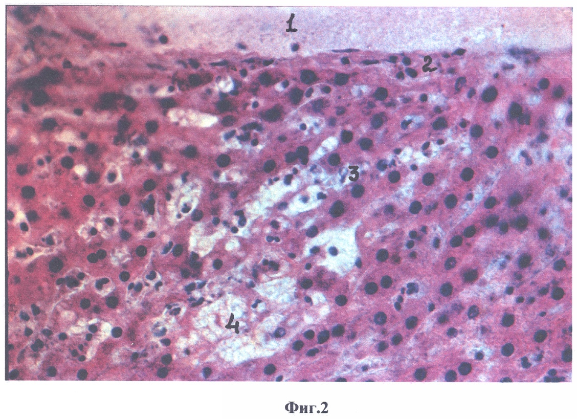 На фиг.1 изображено, что в зоне введения этанола через 24 часа отмечается массовый некроз гепатоцитов и всех клеточных элементов соединительной ткани. Зона некроза ограничена лейкоцитарным валом. За лейкоцитарным валом располагается перинекротическая зона, где наряду с морфологически нормальными гепатоцитами имеется значительное количество гепатоцитов, подвергшихся отсроченной гибели и дегенеративно измененные гепатоциты. В перинекротической зоне также отмечается гиперемия сосудов, диапедез эритроцитов и диффузная инфильтрация тканей печени лейкоцитами.