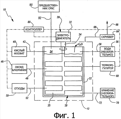Фосфорную кислоту с трудом можно безопасно обрабатывать, особенно если обработка отходов должна проводиться в перчаточном боксе 12 или в подобном оградительном устройстве. Фосфаты одновалентных металлов могут иметь кристаллическую форму, которая может облегчить процесс обработки. Однако в другом варианте кислый фосфат в системе снабжения фосфатами 40 включает и может состоять только из гидрофосфата алюминия, например, AlH3(PO4)2·Н2O, AlH3(PO4)2·3Н2O, и, необязательно, дополнительного оксида алюминия.