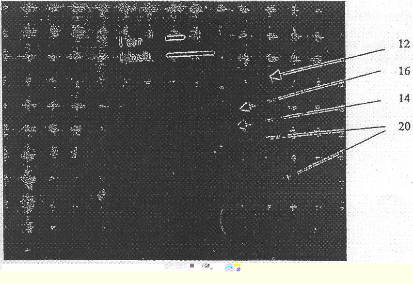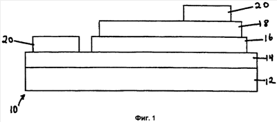 На фиг.1 схематически показан вариант выполнения конденсатора 10 согласно настоящему изобретению. Полимерная подложка 12 (например, Mylar ) покрыта слоем толщиной в один микрон политиофенового проводника 14, в свою очередь, покрытого пленкой пятиокиси тантала 16 толщиной 100 нанометров, а затем снова слоем проводника 18 толщиной один микрон. На слоях 14 и 18 были помещены серебряные контактные пластинки 20. Таким образом был изготовлен конденсатор. В результате тестирования при пяти вольтах он показывает емкость около 350 нанофарад на 1 см2 окисной пленки.