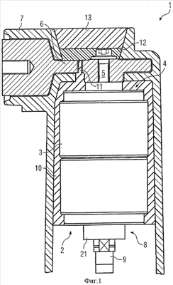 При заполнении текучей компенсационной массы 10 полюс выключателя 1 целесообразно ориентирован противоложно показанному на Фигуре 1 изображению так, что заливочный канал 11 находится под промежуточным пространством и текучая компенсационная масса 10 поднимается снизу вверх против силы тяжести. Таким образом, воздух, находящийся в промежуточном пространстве, медленно вытесняется снизу вверх. Для ускорения описанного процесса заполнения, а также для дальнейшего уменьшения опасности воздушных включений оболочка 7 может быть закрыта на ее приводном отверстии и в возникающем полом пространстве приложено легкое пониженное давление. Для предотвращения отверждения компенсационной массы 10 на оперативной штанге 9 в принципе должно заполняться только такое количество текучей компенсационной массы 10, чтобы промежуточное пространство было заполнено почти полностью. Конечно, возможно и незначительное переполнение так, что переливающаяся часть компенсационной массы 10 течет на приводной стороне 8 вакуумного выключателя 2. В показанном примере выполнения, однако, предусмотрена фасонная закраина 21 для защиты оперативной штанги 9 от отверждающейся компенсационной массы 10. С помощью этой фасонной закраины поэтому является возможной заделка крупных частей приводной стороны 8 в компенсационную массу 10.