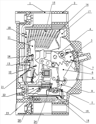 При протекании токов короткого замыкания, достигших заданной величины тока, якорь 23 притягивается к сердечнику 22 и поворачивает рейку 5. Заданную величину тока регулируют регулировочным винтом 24. Рейка 5 выходит из зацепления со скобой 8 механизма свободного расцепления 3, скоба 8 поворачивается по часовой стрелке и освобождается рычаг 6 механизма свободного расцепления 3. Механизм свободного расцепления 3 размыкает подвижный контакт 11 и неподвижный контакт 10 выключателя. Возникающая в процессе размыкания электрическая дуга втягивается за счет электродинамических сил и магнитных полей в узкий промежуток между стальными пластинами 16 дугогасительной камеры 15 и за счет охлаждения и разбивки на отдельные маленькие дуги между стальными пластинами 16 гаснет.