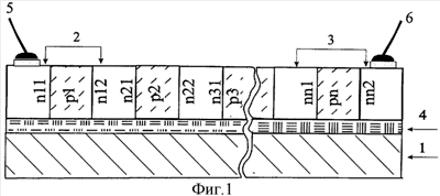 На поверхности, по крайней мере, двух областей n+ типа проводимости выполнена металлизация вдоль всей длины соответствующей области, а под металлизацией выполнена канавка глубиной на всю толщину слоя поликристаллического кремнийсодержащего материала, т.е. на всю толщину соответствующей области (см. фиг.3 и 4).