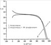 Изготовлены два образца ЛХИТ в габаритах источника тока ВР-3756 (для имплантируемых медицинских приборов). В первом образце для изготовления катода использовался фтористый углерод с содержанием 58-60 мас.% фтора. Состав катода при этом был: фтористый углерод – 95%, графит – 2%, фторопласт Ф4-Д – 3%. Во втором образце в катоде часть фтористого углерода была заменена на фторфуллерен С60F48 с содержанием 55-60 мас.% фтора. Состав катода при этом был: фтористый углерод – 89%, фторфуллерен – 6%, графит – 2%, фторопласт Ф4-Д – 3%. Указанные навески компонентов подвергались вначале сухому смешению, затем мокрому смешению в среде этилового спирта; после предварительной сушки из полученной катодной массы изготавливались катодные пластины необходимого размера, толщиной 1,8 мм и напрессовывались на титановый токосъем, предварительно покрытый коллоидным графитом. В качестве анода служил металлический литий толщиной 0,7 мм. Электролитом служил 1М раствор тетрафторбората лития в гамма-бутиролактоне. Собранные элементы подвергались непрерывному разряду на нагрузку 1 кОм (5 суток) и 120 кОм (2 суток). Как видно из разрядных характеристик (см. чертеж), ЛХИТ с добавкой 6% фторфуллерена (кривая 2) имеет более высокое разрядное напряжение на начальном участке разряда.
