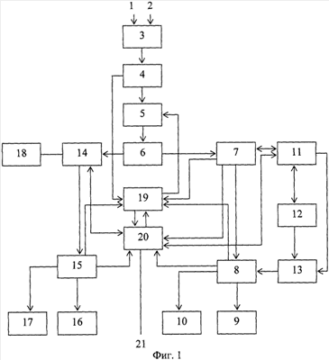 Блок выпрямителей 7 предназначен для преобразования напряжения трехфазного или однофазного переменного тока в напряжение постоянного тока требуемого уровня для питания основных 9 и вспомогательных 10 потребителей. Структурные схемы и возможности различных выпрямителей приведены в известном источнике [5]. Выпрямители блока 7 предназначены для преобразования переменного трехфазного тока с линейным напряжением 380 В в напряжение постоянного тока 27 В для питания основных потребителей постоянным током. Блок 7 обеспечивает автоматическое включение при подаче на его вход с выхода блока 6 переменного тока, преобразование напряжения переменного тока в постоянное напряжение указанной выше величины, защиту от перегрузки без отключения потребителей посредством ограничителя тока непрерывного действия, выдачу непосредственно и через блок 8 по информационному выходу на блок 20 сигналов исправной и аварийной работы.