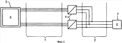 Как к первичной системе 1, так и к вторичной системе 2 могут подключаться не представленные на чертеже нагрузки, например, двигатели или другие приводные устройства. Связанный со вторичной системой 2 генератор 7 может служить в качестве аварийного генератора и обеспечивать энергоснабжение как во вторичной системе 2, так и в первичной системе 1 в случае, если главный генератор 3 не работает.