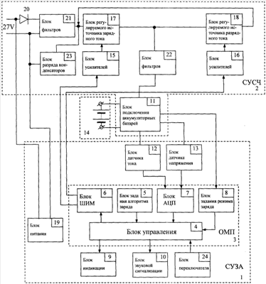 Устройство включает систему управления по заданному алгоритму (СУЗА) 1 и систему управления силовой частью (СУСЧ) 2. Блок 3 ОМП состоит из блока 4 управления, блока 5 задания алгоритма заряда, блока 6 ШИМ, блока 7 АЦП и блока 8 задания режима заряда и соединен с блоком 9 индикации, блоком 10 звуковой сигнализации, блоком 11 подключения аккумуляторных батарей, блоком 12 датчика тока и блоком 13 датчика напряжения. Входы блоков 12 и 13 датчика тока и датчика напряжения соответственно соединены с соответствующими выходами блока 11 подключения АБ, входы которого соединены с блоком 14 АБ. Выходы блока 6 ШИМ соединены с входами соответствующих блоков 15 и 16 усилителей, выходы которых соединены со входами блоков 17 и 18 регулируемых источников зарядного и разрядного тока соответственно. Питающее напряжение подается на блок 19 питания, положительный вывод питающего напряжения соединен с анодом диода 20, катод которого соединен со входом блока 21 фильтров. Выход блока 21 фильтров соединен с входом блока 17 регулируемого источника зарядного тока, представляющего собой ШИМ-преобразователь понижающего типа, выход которого соединен со входом блока 22 фильтров и входом блока 18 регулируемого источника разрядного тока, представляющего собой ШИМ-преобразователь повышающего типа. Выход блока 22 фильтров соединен с блоком 11 подключения аккумуляторных батарей. Выход блока 18 регулируемого источника разрядного тока соединен с выходом блока 21 фильтров и входом блока 17 регулируемого источника зарядного тока. Блок 23 разряда конденсаторов соединен одним выводом с точкой соединения блока 21 фильтров и блока 17 регулируемого источника зарядного тока, другим выводом – с отрицательным выводом питающего напряжения. Блок 24 переключателя соединен с блоком 4 управления.