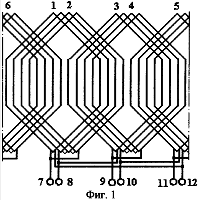 Согласно фиг.5 соотношение величин ЭДС между выводами обмотки 8 и 12 и выводами 7 и 11 составляет 1/0,81. Соотношение ЭДС и угол между векторами ЭДС можно корректировать соотношением витков в катушках больших и малых катушечных групп.