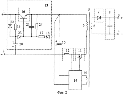 Возможны и другие реализации управляющей цепи 14, например, в соответствии со схемами, представленными в [3] и [4]. В этом случае сохраняются показанные на фиг.2 подключения управляющей цепи 14 к конденсатору 10 и датчику тока 12, а вместо подключения к обмотке 15 применяется подключение к выходным зажимам 3 и 4.