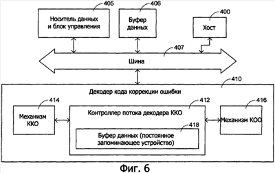 Рассмотрим фиг.6. На фиг.6 представлено настоящее изобретение – декодер кода управления ошибкой в устройстве накопителя, который содержит буфер 406 данных, используемый для временного сохранения блока кода коррекции ошибки с оптического диска для следующих процессов декодирования; декодер 410 управления ошибкой, который содержит контроллер 412 потока ККО, предназначенный для управления потоком декодирования управления ошибкой; механизм 414 ККО, который может состоять из множества модулей различных процессов декодирования и управления машиной с конечным числом состояний, для декодирования кодов, которые закодированы с использованием смеси различных способов кодирования. Кроме того, механизм 414 ККО содержит, по меньшей мере, одну процедуру ВЧ и, по меньшей мере, одну процедуру НЧ. Настоящее изобретение, для пояснения его принципов, будет описано ниже на примере механизма ККО, имеющего, по меньшей мере, одну процедуру ВЧ и, по меньшей мере, одну процедуру НЧ. Однако следует отметить, что настоящее изобретение не ограничивается механизмом ККО только с одной процедурой ВЧ и одной процедурой НЧ. Устройство декодера управления ошибкой дополнительно состоит из n контроллеров декодирования управления ошибкой, механизма 414 ККО, механизма 416 КОО, которые могут быть выполнены с использованием логических схем или функций микропрограммы микропроцессора. Для передачи основного принципа настоящего изобретения носитель данных (такой как оптический диск, жесткий диск и т.д.), показанный на иллюстрациях, и блок управления в устройстве накопителя показаны как один элемент, называемый носителем данных и блоком управления 404. Носитель данных и управление выполняют обмен данными с хостом 400 через шину 402. Кроме контроллера 412 потока декодера ККО, который проверяет значение повторных попыток, настоящее изобретение имеет дополнительное постоянное запоминающее устройство 418, в котором записывают результат выполнения механизма 414 ККО и механизма 416 КОО. Добавление такого постоянного запоминающего устройства 418 помогает ускорить поиск отказа ККО. В одном варианте выполнения назначение постоянного запоминающего устройства 418 состоит в сохранении “немодифицированного значения”.