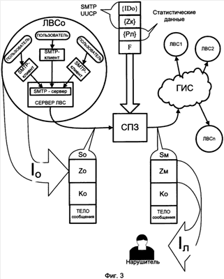 С целью получения идентификационной информации и подготовки преднамеренного деструктивного воздействия нарушитель может анализировать не только сообщения пользователей, но и сообщения-отклики почтового сервера на определенные команды, поступающие из глобальной информационной сети. Разработаны и применяются специализированные программы, которые позволяют с использованием заранее подготовленных статистических данных выделить эту информацию (UST.IEviaOLE [ustinfo.ru]). При этом возможны «легальное» взаимодействие с пользователем локальной вычислительной сети или несанкционированный перехват сообщения, передаваемого посредством глобальной информационной сети (фиг.2). При «легальном» взаимодействии с пользователем локальной вычислительной сети нарушитель отсылает и получает сообщения из интересующей его сети, затем анализирует содержание и заголовки полученных сообщений.