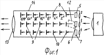 Принцип действия ячейки основан на том, что каждое впереди расположенное полупрозрачное микрозеркало 8 /9, 10/ пропускает на следующее за ним поток излучения, ослабленный в два раза, что соответствует принципу двоичного кода. Для полупрозрачных микрозеркал применяется светоделительное покрытие, выполняющее отношение отраженного излучения к пропущенному как 1:0,5, т.е. каждое микрозеркало 8 /9, 10/ пропускает поток излучения в 50% от отраженного потока [6, с.223]. Для исключения посторонних отражений /световых помех/ на общее зеркало 12 в корпусе элемента матрицы 14 стенки его имеют светопоглащающее покрытие. Ячейки работают идентично. Излучающая плоскость светодиода 1 расположена в фокальных плоскостях микролинз 2, 3, 4. Излучение светодиода 1 собирается каждой микролинзой 2, 3, 4 ячеек и через свои цветные светофильтры 5, 6, 7 поступает на первые полупрозрачные микрозеркала 8, 9, 10. В отсутствие управляющих сигналов на входах пьезоэлементов 11 микрозеркала находятся в первом фиксированном положении. Поток излучения после цветного светофильтра 5 /фиг.3/ проходит сквозь все восемь полупрозрачных зеркал, но не отражается на общее зеркало 12. Каждое полупрозрачное микрозеркало в ячейке ослабляет проходящий через него поток в 2 раза. После первого микрозеркала поток ослабляется в 2 раза, после второго – в 4 раза, после третьего – в 8 раз, четвертого – в 16 раз, пятого – в 32 раза, шестого – в 64 раза и после седьмого в 128 раз, выполняется порядок двоичного кода. При поступлении кода цветового сигнала с блока, формирующего управляющие сигналы для пьезоэлементов трех ячеек, на управляющие входы пьезоэлементов 11 поступают управляющие сигналы длительностью, равной длительности кадра, по амплитуде, равной рабочему напряжению срабатывания пьезоэлемента 11. Исполнительным перемещением пьезоэлемента является изгиб. В качестве пьезоэлементов применяются трубчатые пьезоэлементы, работающие на изгиб. Достоинство их -прочность и надежность [7, с.27]. При изгибе свободный конец пьезоэлемента перемещается на соответствующее число микрометров и переводит свое полупрозрачное микрозеркало во второе положение, при котором отраженное излучение с него поступает на общее зеркало 12, а 50% излучения проходит как и прежде сквозь микрозеркало на следующее за ним. Первая ячейка выполняет преобразование “код R – яркость красного цвета”, вторая ячейка, выполняет преобразование “код G – яркость зеленого цвета”, третья – “код B – яркость синего цвета”. Полупрозрачные микрозеркала трех ячеек, на пьезоэлементы которых поступили управляющие сигналы, переходят во второе положение и направляют отраженные излучения трех цветовых сигналов на общее зеркало 12, расположенное в фокальной плоскости выходной микролинзы 13, которая производит сбор суммарного результирующего излучения с общего зеркала 12 и формирует изображение пиксела соответствующего цветового тона на стекле экрана монитора или телевизора. Вариант размеров элементов матрицы: диаметры микролинз 2, 3, 4 приняты по 0,25 мм, цветных светофильтров 0,25 мм, размер полупрозрачных микрозеркал 0,2·0,2 мм, размер общего зеркала 12 0,5·0,5 мм, размер торцов корпуса элемента матрицы 0,8·0,8 мм. Длина корпуса определяется расстоянием от последнего полупрозрачного зеркала до микролинзы 2 /3, 4/ и составит до 2 см. Число элементов матриц в экране 