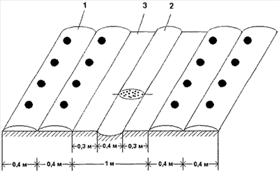 На чертеже представлена схема заделки измельченной зеленой массы, согласно которой позицией 1 обозначены грядки с посадками картофеля, позицией 2 – зеленое удобрение, внесенное в почву в канаву междурядья, позицией 3 – слой почвы в междурядьях для окучивания.