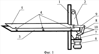 Корпус 3 представляет собой полый брус с продольным разрезом по верхней грани. Внутри корпуса 3 на шатунах 4 установлен подвижный нож 5, обращенный лезвием вверх. Нож 5 приводится в движение от гидровибратора 6, закрепленного на раме 1. От штока 7 гидровибратора 6 возвратно-поступательные движения передаются на коромысло 8, которое через тягу 9 сообщает ножу 5 колебательные движения, для чего соединения элементов привода ножа сделаны шарнирными – 10.