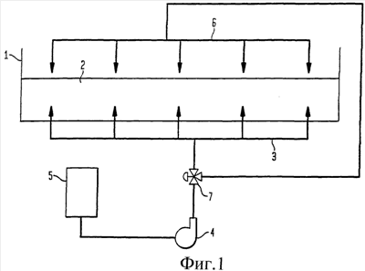 Еще один альтернативный вариант или способ введения композиции в масло, особенно предпочтительный для использования на большом жарочном оборудовании, таком как используемое в пищевой промышленности (см. фиг.1). В этом варианте композицию можно вводить в жарочную емкость (1) из резервуара (5), содержащего композицию, через расположенные заданным образом отверстия, например, выше (3) и/или ниже (6) поверхности масла (2), используя регулируемый клапан (7), чтобы вводить пар, или туман, или густой туман из мелких капель диаметром от около 0,1 мм до около 3,0 мм, например, от около 0,1 мм до около 3,0 мм. Предпочтительно, композицию вводят ниже поверхности масла, при этом предпочтительный размер капель составляет от около 1,0 мм до около 1,5 мм в диаметре. Скорость добавления композиции можно регулировать, например, с использованием дозирующего насоса (4). Данный процесс предпочтительно совершают в течение фиксированных промежутков времени, например, после того, как масло находилось при повышенной температуре приготовления пищи, после фиксированных интервалов приготовления или по результатам периодического измерения свойств масла и/или визуального контроля внешнего вида и внутренней температуры пищи (кулинарная производительность масла). Скорость введения может меняться с точки зрения измеряемых или наблюдаемых свойств масла и пищи. Дозированный ввод композиции также может изменяться автоматическим путем детектирования ключевых свойств масла, таких как содержание свободных жирных кислот (FFA), пероксидное содержание или содержание полярных соединений. Такие временные интервалы легко выбрать специалисту в области приготовления пищи и особенно в области приготовления жареной пищи, после ограниченного количества экспериментов или в результате опыта, используя способы, показанные в данном документе. Следовательно, водяную антиоксидантную композицию, содержащую, например, по меньшей мере одну пищевую кислоту и/или по крайней мере один травяной экстракт, и воду, добавляют в количестве, которое компенсирует потерю или деградацию антиоксиданта, через выбранный период времени, или регулируют качество композиции кулинарного масла до заданного экспериментальными измерениями значения автоматическим или ручным образом.