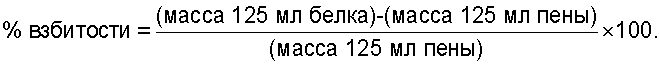 Как видно из данных таблицы XI, изолят белка канолы почти полностью растворялся при всех контрольных значениях рН, но наиболее высокая растворимость его отмечалась в области рН от 4,0 до 6,0. Пример 11 Настоящий пример показывает пенообразующие свойства трех отдельных партий изолята белка канолы. Использованный в примере метод описан в Phillips et al., J. Food Sci. 55: 1441, 1990. Образцы (по 3,75 г) изолята белка канолы BW-AL016-J24-01A-C200, полученного, как описано в примере 1, и изолятов белка канолы BW-AL017-D11-02A-C200 и BW-AL018-E29-02A-C200, полученных, как описано в примере 2, помещали в отдельные лабораторные стаканы емкостью 150 мл. К белку добавляли 60 мл 0,075 М раствора NaCl с получением сначала пастообразной смеси при растворении белка в нескольких мл жидкости. Смесь перемешивали с помощью магнитной мешалки в течение 10 минут. рН раствора устанавливали на уровне рН 7,00 добавлением 0,1 М раствора NaOH и раствор вновь перемешивали в течение еще 10 минут. Затем рН повторно устанавливали на уровне рН 7,00 и объем жидкости доводили до 75 мл добавлением требуемого количества 0,075 М раствора NaCl для получения 5% масс./об. белкового раствора. 75 мл полученного раствора переносили в чашу миксера Хобарт и замеряли общую массу раствора, чаши миксера и взбивалки. Белковый раствор взбивали на скорости 3 в течение 5 минут. Достаточное количество пены осторожно отбирали из чаши и с помощью резинового шпателя переносили в 2 мерных стаканчика, тарированных на 125 мл. Избыток пены удаляли, используя для этого плоский конец широкого ножа таким образом, чтобы верхняя поверхность пены была вровень с верхней частью мерного стаканчика, и замеряли массу пены. Затем пену осторожно возвращали в чащу миксера и взбивали в течение еще 5 минут. Процедуру повторяли. Пену осторожно возвращали в чашу миксера и вновь взбивали в течение еще 5 минут, т.е. общая продолжительность взбивания составила 15 минут. Процедуру вновь повторяли. % взбитости рассчитывали по следующему уравнению: Тестировали также стабильность пены. Белковый раствор готовили по той же методике, что и для измерений % взбитости, за исключением того, что белковый раствор взбивали в течение 15 минут на скорости 3. Используя резиновый шпатель, пену осторожно переносили в воронку на 1 л с длинным отводящим концом, опущенным в мерный цилиндр на 250 мл. Перед перенесением пены в верхнее отверстие воронки помещали небольшое количество минеральной (кварцевой) ваты для предупреждения расползания пены, позволяя при этом жидкости стекать. Измеряли объем жидкости, накопившейся в мерном цилиндре спустя 5, 10 и 15 минут. Объем, удерживаемый ватой, прибавляли к конечному объему. Эксперименты повторяли для проведения сравнительной оценки с яичным белком, изолятом белков молочной сыворотки (Alacen 895 от фирмы New Zealand Milk Products) и изолятом соевого белка (Profam 891 от фирмы Archer Daniels Midland). Полученные результаты приводятся в таблицах XII, XIII, XIV и XV.