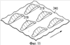 На фиг.11 изображено множество полностью готовых кусочков 319 закуски. Кусочки 319 закуски транспортируются на выходном транспортере 340, чтобы направиться далее для кондиционирования и упаковки. Поскольку кусочки 319 закуски были отформованы на выпуклых формах 325, кусочки 319 закуски имеют вогнутую форму с обращенной вверх вогнутой стороной. Как показано, эта форма представляет собой эллипс, в котором продольные края каждого готового кусочка 319 закуски загнуты вверх от поверхности выходного транспортера 340. Хотя изображена в общем случае эллиптическая форма, возможны и другие формы вроде квадратов, кругов или треугольников в зависимости от формы кусочков полуфабриката.