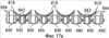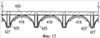 На фиг.12 и 13 изображен другой вариант конструкции форм по сравнению с формами на фиг.9 и 10. Фиг.12 представляет собой поперечное сечение верхнего транспортера 420, имеющего множество форм 425, которые являются вогнутыми относительно множества кусочков 418 закуски. 3а исключением формы вогнутые формы 425 на фиг.12 имеют аналогичную конструкцию с выпуклыми формами 325 на фиг.11. Вогнутые формы 425 на Фиг.12 крепятся к верхнему транспортеру 420 при помощи множества опор 427. При такой конструкции обжаривающиеся кусочки 418 формуются выпуклой формы с выпуклой стороной, обращенной вверх. Так же как и на фиг.10 на фиг.13 изображено множество поперечных участков 426 форм, соединенных шарнирно между собой наподобие звеньев цепи. Это позволяет верхнему транспортеру 420 иметь жесткие вогнутые поверхности, вогнутые относительно обжаривающегося продукта, на множестве отдельных форм 425, служащие для формования кусочков пищевого продукта, и в то же время совершать дугообразное движение вокруг роликов. Формы 425 крепятся к верхнему транспортеру 420 при помощи множества опор 427 и имеют множество отверстий 429 с теми же характеристиками, что и отверстия, описанные при рассмотрении фиг.10.