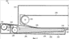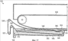 На фиг.1 показан пример известного формовочно-обжарочного аппарата. Обжарочный аппарат 10 имеет корпус 12 обжарочного аппарата, в котором находятся транспортеры для перемещения через него полуфабрикатов. Для поддержания внутри корпуса 12 необходимых условий среды, внутри обжарочного аппарата над маслом и вокруг него может циркулировать пар или инертный газ, который подается через канал 14, хотя при необходимости можно предусмотреть дополнительные каналы. Верхняя лента 20 расположена в верхней части корпуса 12 обжарочного аппарата и приводится в движение при помощи двух роликов 22, 24. Нижняя лента 30 расположена ниже верхней ленты 20. Нижняя лента 30 представляет собой сплошную петлю и поддерживается и приводится в движение при помощи двух роликов 32, 34. Противень 50 обжарочного аппарата, содержащий масло 52, расположен внутри корпуса 12 обжарочного аппарата таким образом, чтобы по крайней мере какая-то часть верхней ленты 20 и нижней ленты 30 находились внутри масла 52 в то время, когда они расположены в непосредственной близости друг от друга. Масло 52 циркулирует через противень 50 обжарочного аппарата от впускного отверстия 54 до выпускного отверстия 56 при помощи, например, насоса (не показано). Необходимую для обжаривания температуру масла можно поддерживать при помощи пара, который пропускается вокруг противня 50 обжарочного аппарата.