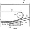 На фиг.3-8 изображены несколько возможных вариантов выполнения, соответствующих данному изобретению, входной зоны 202 и выходной зоны 204 обжарочного аппарата. Входная зона 202 обжарочного аппарата на этих чертежах имеет те же отличительные черты и ту же конструкцию, что и описанная выше входная зона 102 обжарочного аппарата, показанная на фиг.2. Сейчас одновременно рассмотрим фиг.3-8. Как показано, корпус обжарочного аппарата 212 содержит верхний транспортер 220, поддерживаемый роликами 222, 224. Нижний входной транспортер 230, имеющий подающий участок и обратный участок, поддерживается, по крайней мере, двумя из нескольких роликов 232, 234, 235, 236, 237, 238. Противень 250 с маслом обжарочного аппарата содержит горячее масло 252. Внутри входной зоны 258 противня с маслом показана область, достаточная для размещения ввода 254 масла и, по крайней мере, одного ролика для поддержания нижнего входного транспортера 230.