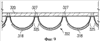 На фиг.9 и 10 изображено множество форм 325, расположенных на верхнем транспортере 320. На фиг.9 изображено поперечное сечение этих форм, расположенных на верхнем транспортере 320. Силы, направленные вверх из обжаривающего масла 352, удерживают обжаривающиеся кусочки 318 закуски прижатыми к поверхности множества форм 325. Эти формы 325 закреплены при помощи множества опор 327 на верхнем транспортере 320. Верхний транспортер 320 и формы 325 могут включать проницаемую для масла цепную конструкцию, изготовленную из износостойкого материала вроде нержавеющей стали, другого металла, керамики или материала на основе полимера, способного противостоять воздействию горячего масла. В качестве альтернативы верхний транспортер 320 также может включать любой пригодный для пищевых целей перфорированный, износостойкий, но гибкий материал, способный выдерживать температуру масла при обжаривании. Кроме того, каждая форма 325 изготавливается со множеством отверстий или каналов, позволяющих пару или другим газам подниматься и проходить через них, чтобы выйти из обжаривающегося масла 352. Это необходимо, чтобы удалять газы, выделяемые в процессе обжаривания, которые в противном случае будут скапливаться и смещать кусочки закуски. На фиг.10 представлен перспективный вид форм 325, изображенных на фиг.9. Здесь показано множество отверстий 329. В предпочтительном варианте выполнения эти отверстия просверливаются вдоль осей, перпендикулярных верхнему транспортеру 320, а не вдоль осей, перпендикулярных поверхности форм 325. Просверливание отверстий указанным образом помогает предотвратить нежелательное прилипание продукта к поверхности форм, когда части кусочков полуфабриката поднимаются в отверстия 329. На фиг.10 также показаны поперечные участки форм 326, соединенные шарнирно друг с другом наподобие звеньев цепи. Это позволяет верхнему транспортеру 320 иметь жесткие вогнутые поверхности, служащие для формования кусочков пищевого продукта, и в то же время совершать дугообразное движение вокруг роликов. Кроме того, формы 325 сконструированы таким образом, чтобы в них формовались кусочки закуски, имеющие одинаковую форму, позволяющую укладывать их друг на друга в контейнер типа банки.