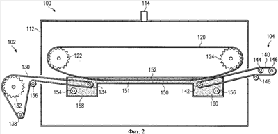 Рассмотрим снова фиг.2. Агрегат 100 обжарочного аппарата осуществляет обработку полуфабриката (здесь не показан), проходящего через формовочно-обжарочный аппарат посредством верхнего транспортера 120, нижнего входного транспортера 130 и нижнего выходного транспортера 140. На верхнем транспортере 120 по его наружной поверхности расположено множество форм (не показаны), предназначенных для захвата и формования кусочков полуфабриката, чтобы произвести готовые кусочки закуски заданной формы. Верхний транспортер 120 может включать проницаемую для масла ценную конструкцию из износостойкого материала вроде нержавеющей стали или других металлов, керамики, материалов на основе полимеров, способных противостоять воздействию горячего масла. Для поддержания и направления верхнего транспортера 120 служат два ролика 122, 124. Как показано, эти два ролика 122, 124 могут иметь зубцы для сцепления с верхним транспортером 120 и приведения его в движение. В общем случае привод обеспечивается только одним из двух роликов 122, 124.