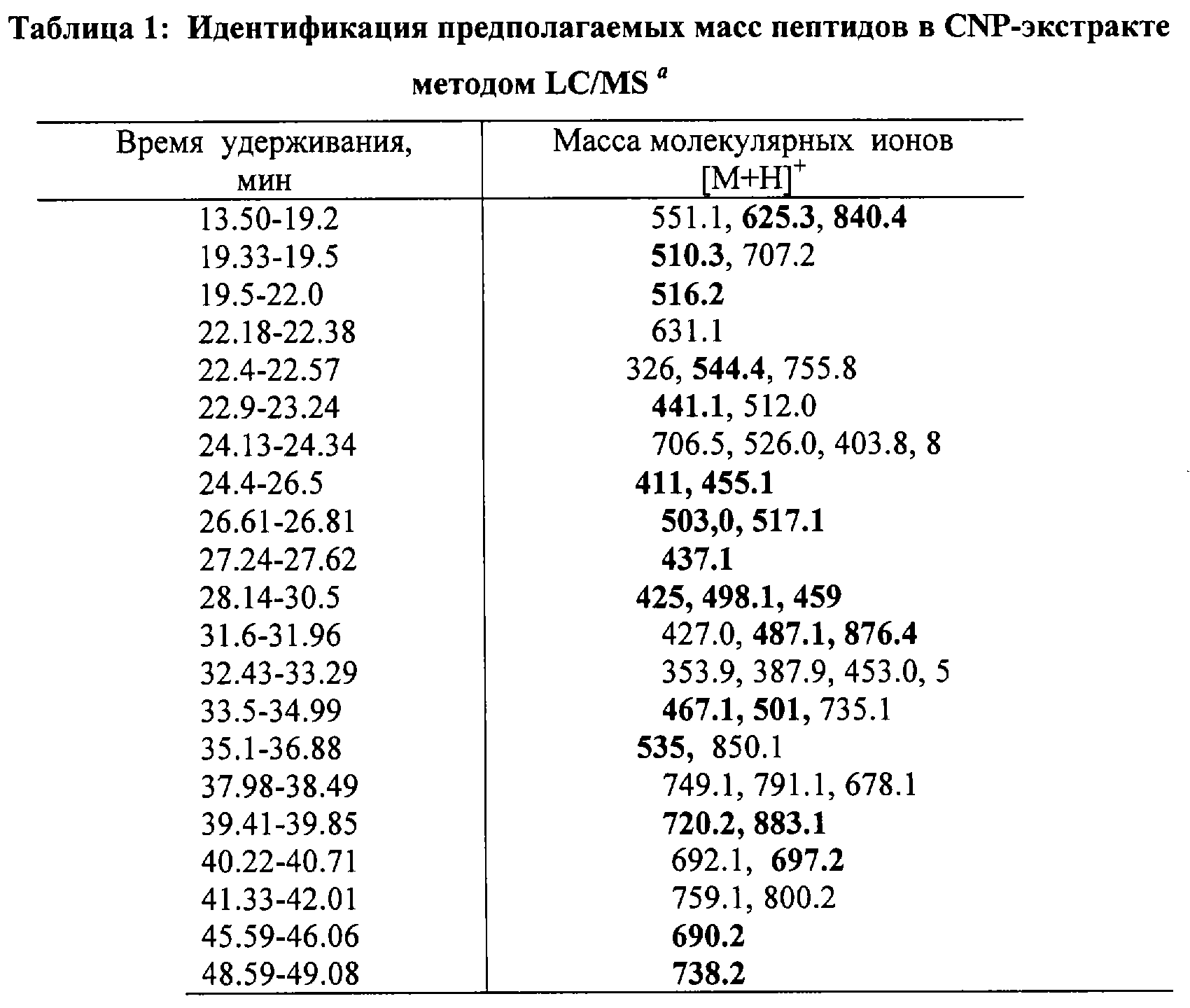 Анализ экстракта какао-порошка из ядер какао-бобов (CNP) масс-спектрометрией с ионизацией электрораспылением (ESI) в комбинации с обращенно-фазной жидкостной хроматографией высокого разрешения (RP-HPLC) в режиме хроматографии с использованием системы растворителей трифторуксусной кислоты/ацетонитрила (TFA/ACN) позволил обнаружить только небольшое количество масс из-за относительно малого избытка большинства ионов (1-6×104). Это, по-видимому, можно объяснить слабой ионизацией «голых» свободных аминокислот и короткоцепочечных пептидов. Предколоночная дериватизация с FMOC с последующим LC/MS анализом CNP-экстракта позволила обнаружить большое количество пиков (фиг.1). Были составлены подробный перечень присутствующих общих моноизотопных ионов, а на основе известных значений времени удерживания и массы молекулярных ионов аминокислот – перечень масс потенциальных пептидов (таблица 1). Все неизвестные массы за исключением массы 222 (доля FMOC) показали положительное парное соответствие до 5 остатков синтетическим пептидам из базы данных.